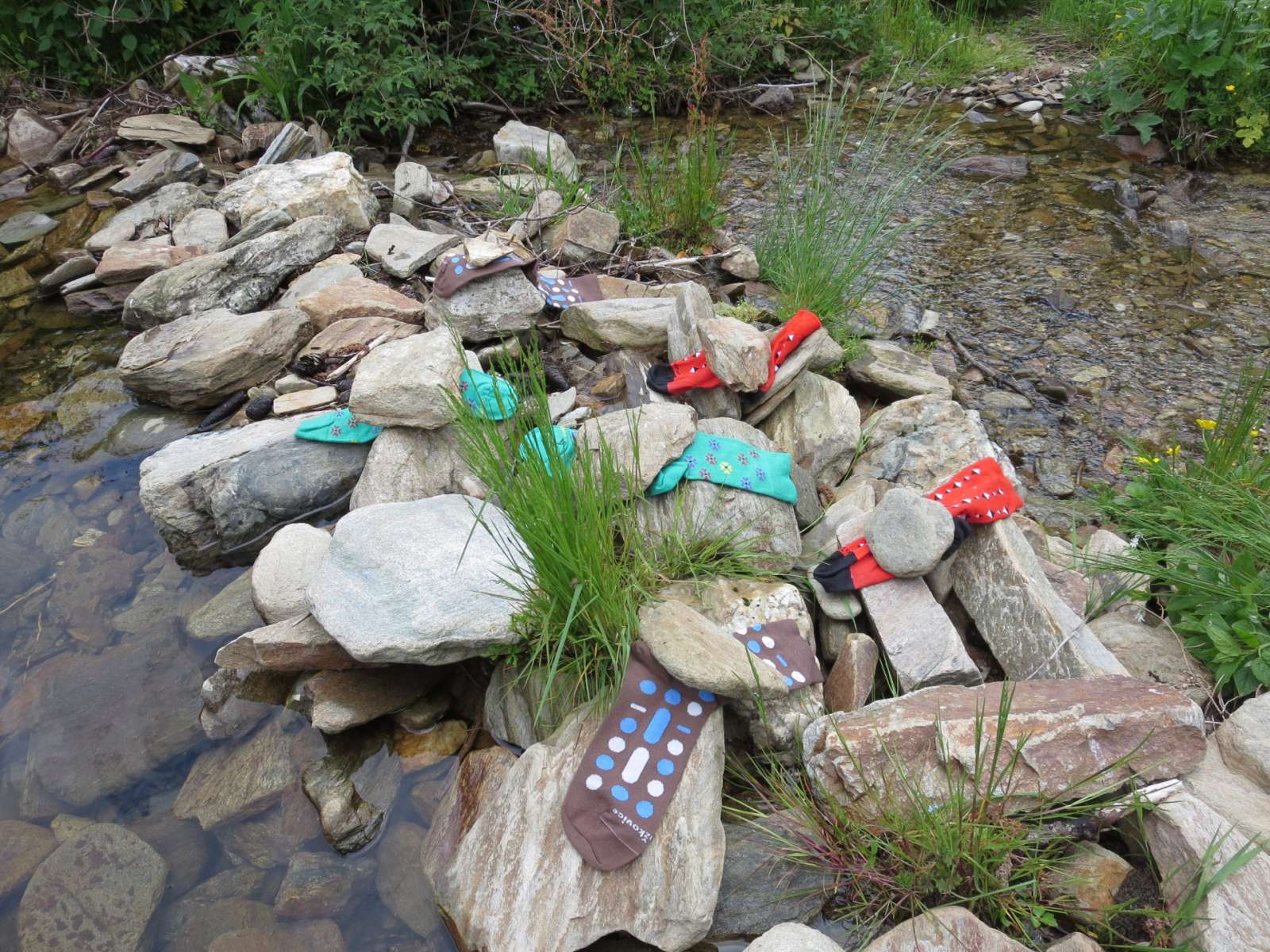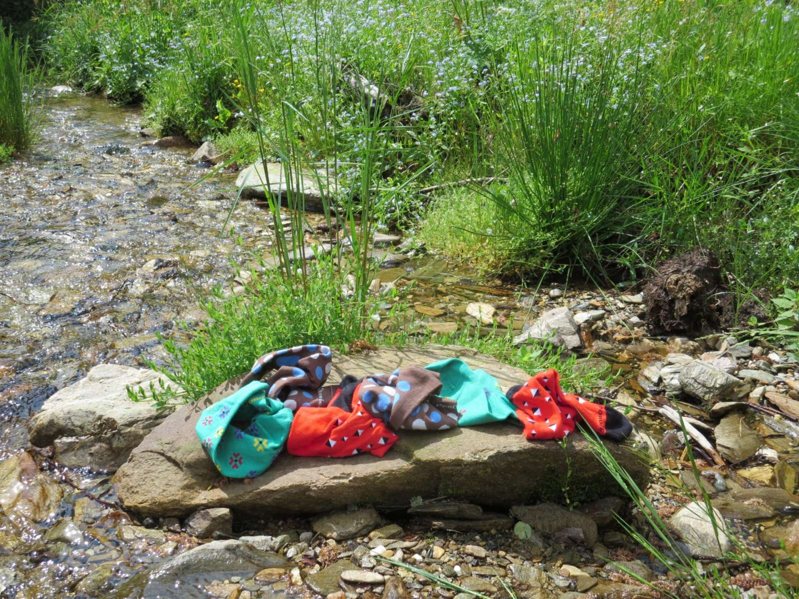 Jeden z potůčků v Horní Malé Úpě se rozvodnil při jarních deštích a valící se kameny skončily na ponožkách, které jsem tam sušil po horské túře.