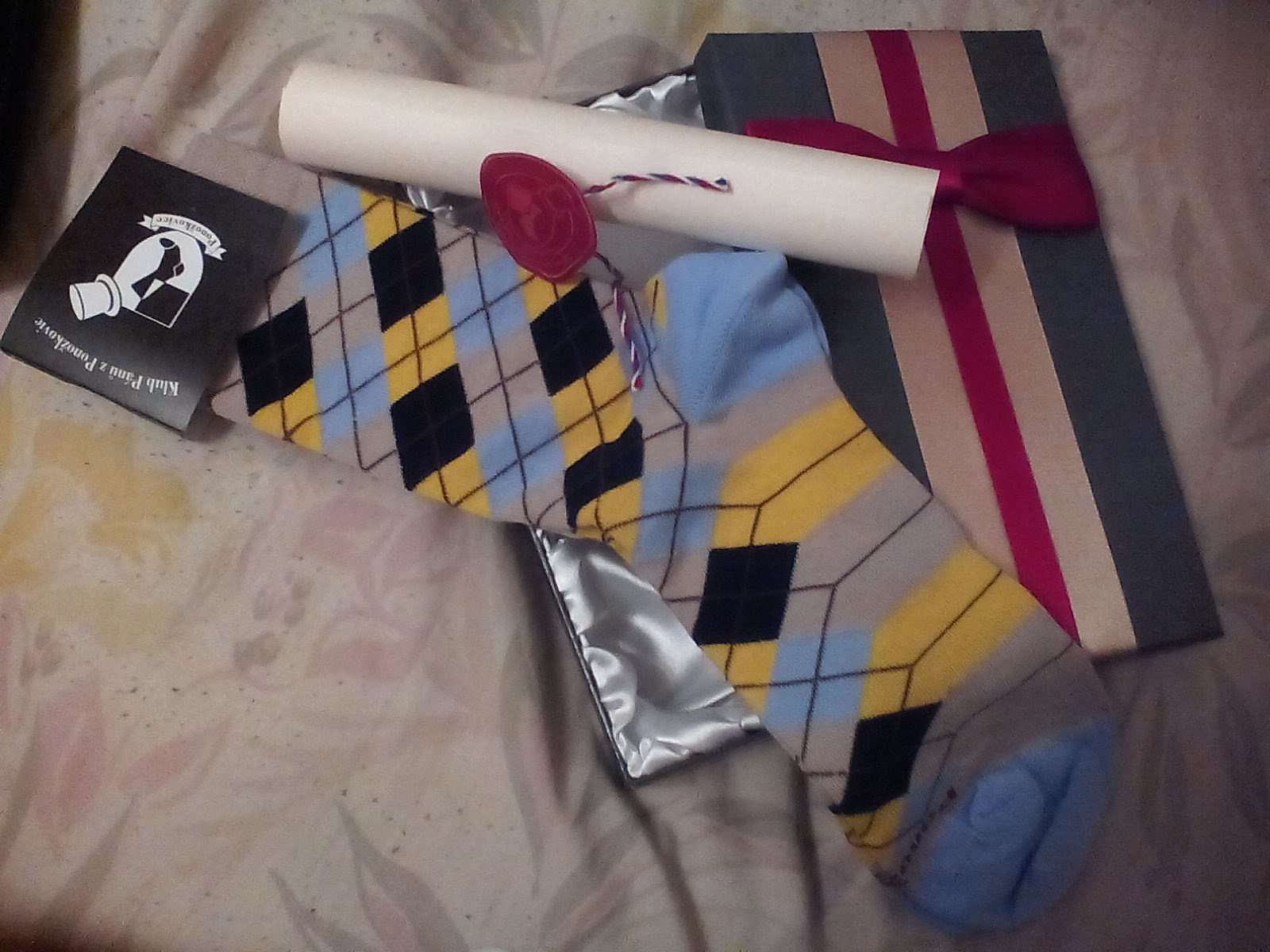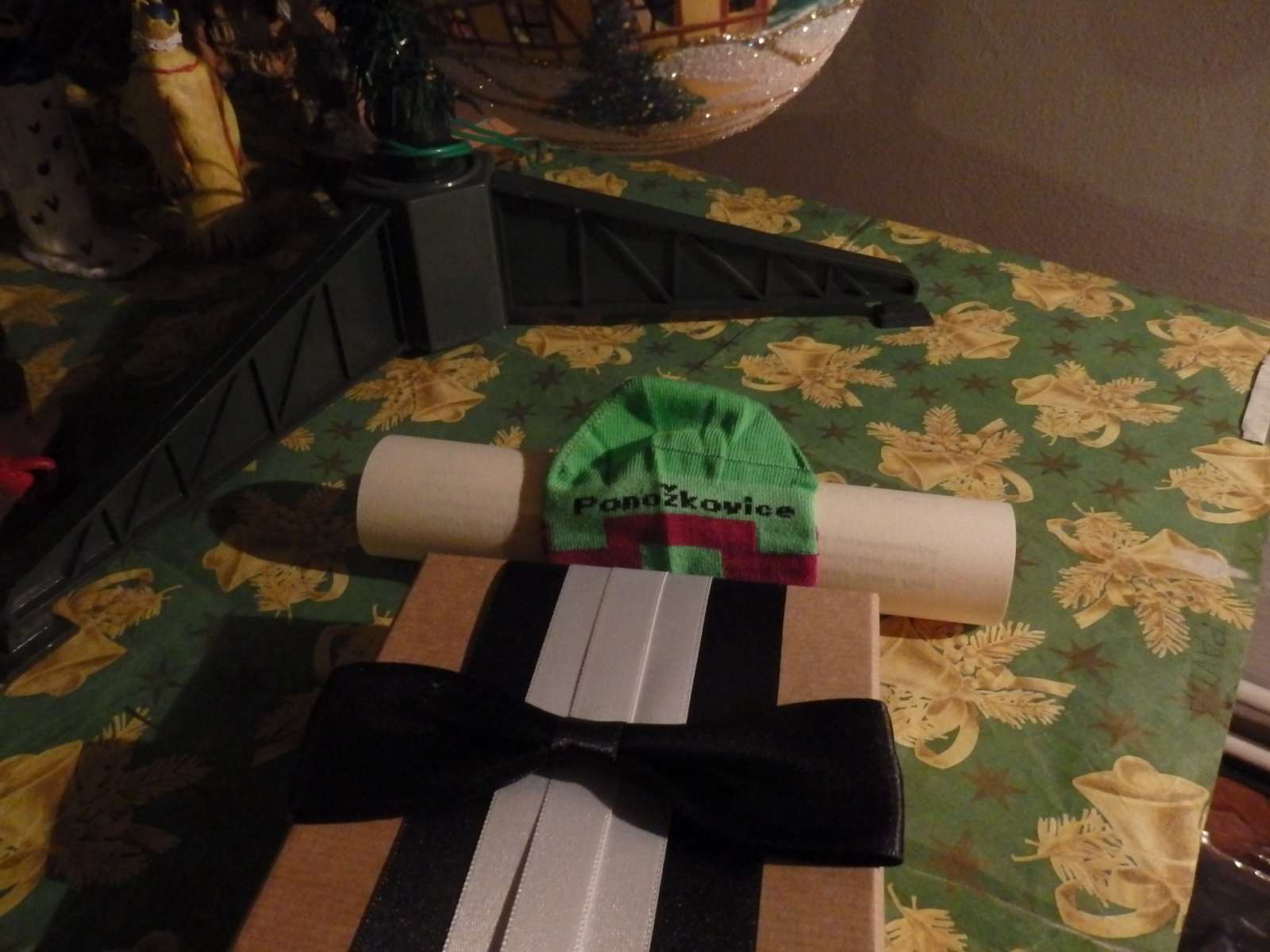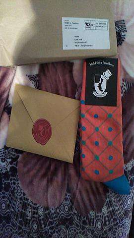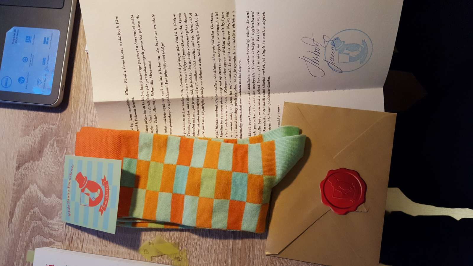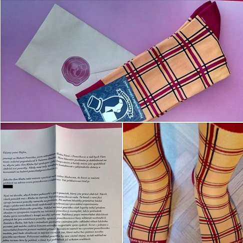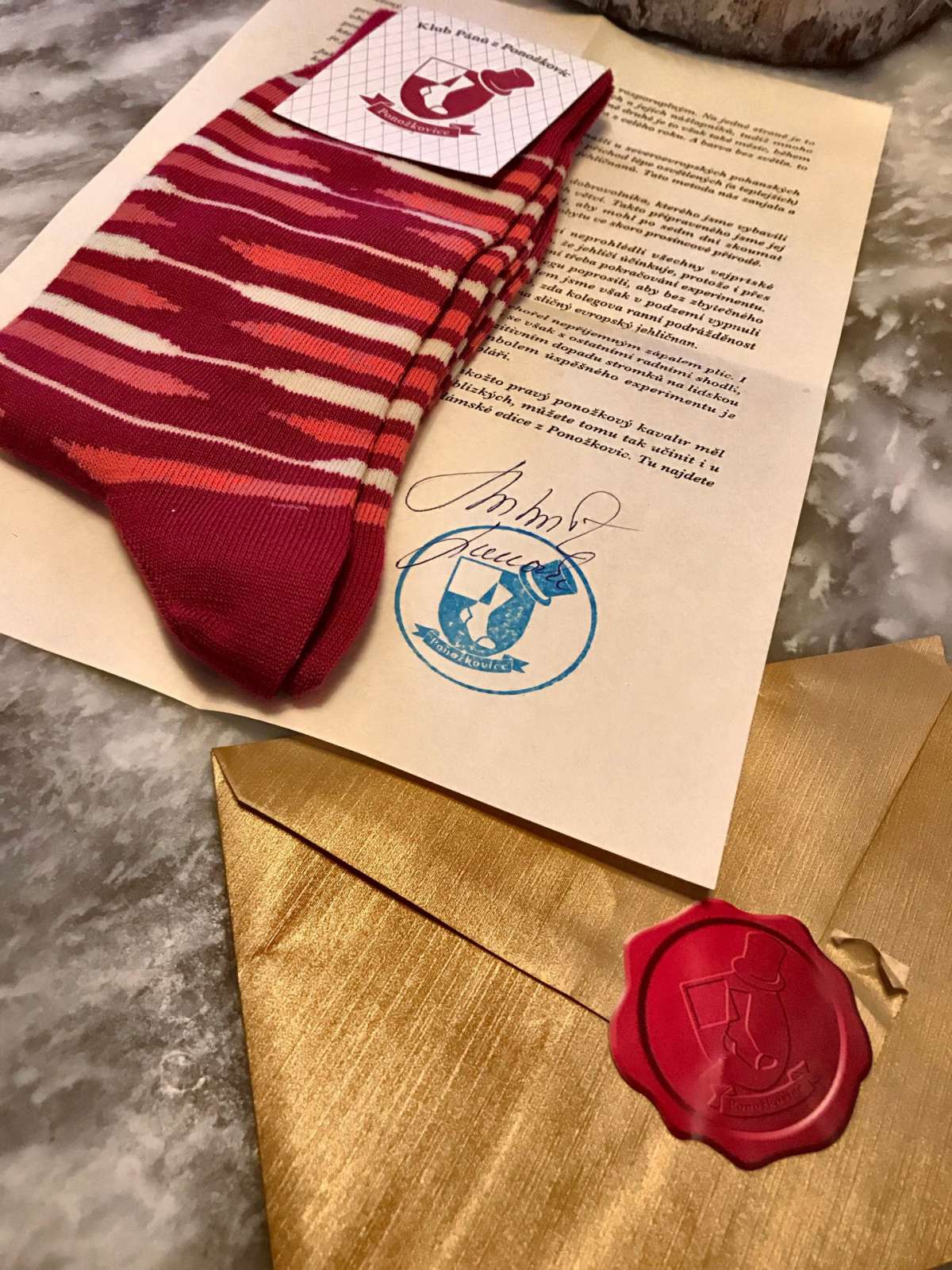 Přijedu domů po náročném víkendu a hle ... obálka s neznámým a neobvykle měkkým obsahem. Netuše žádnou zradu, jal jsem se balíček rozdělávat. Předčasné vánoční překvapení na mne vykouklo i se zlatavým dopisem. Párek originálních ponožek luxusně padnoucích na mé znavené nohy. Zítra musím vyzkoušet jejich eleganci v běžném životě...