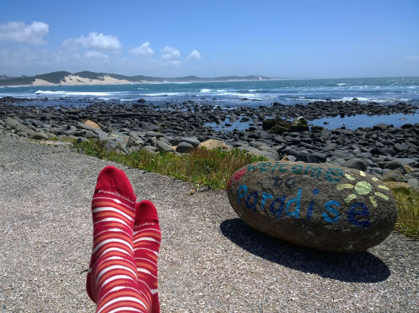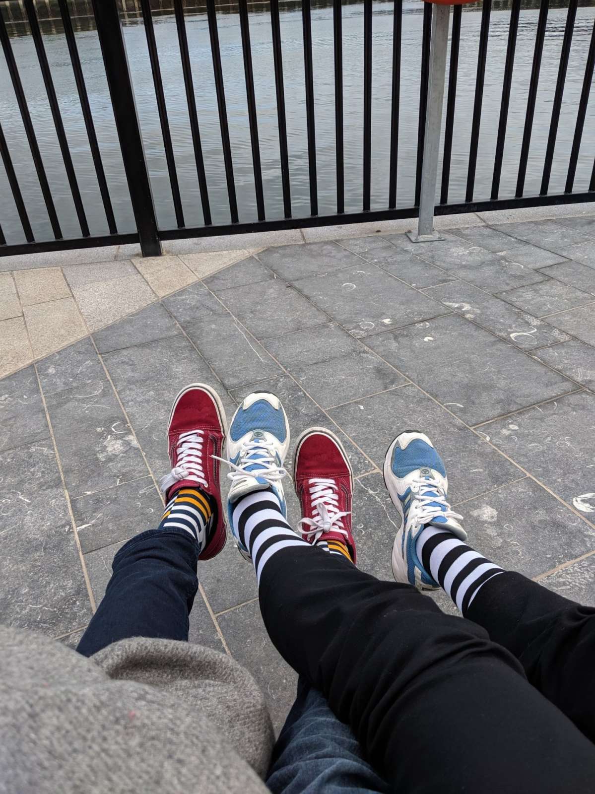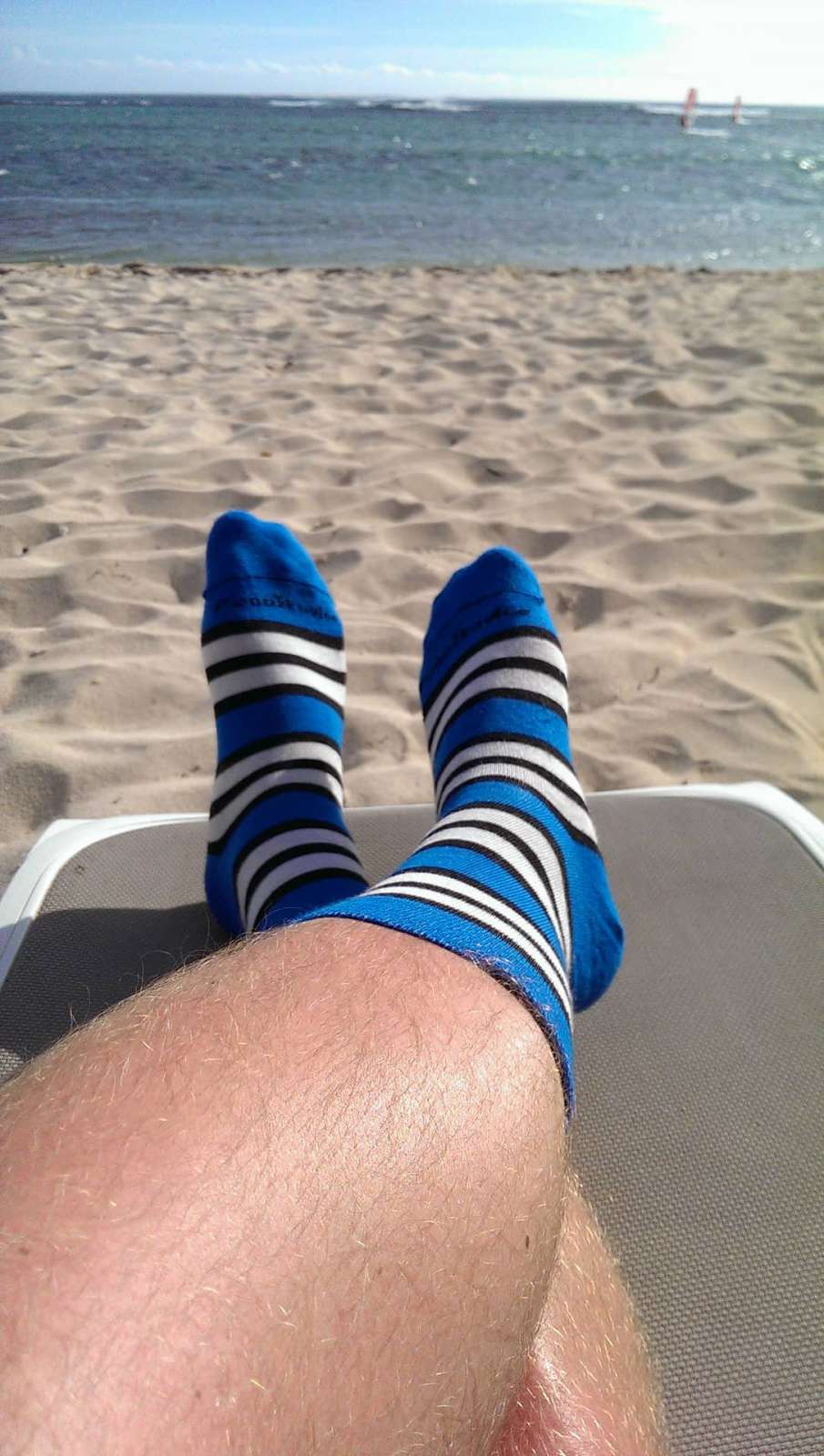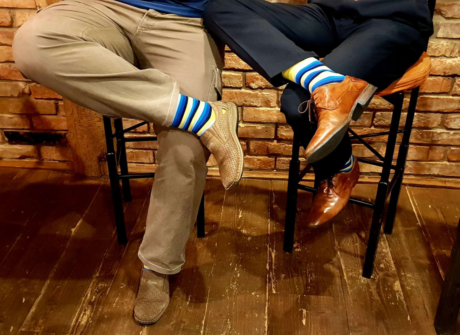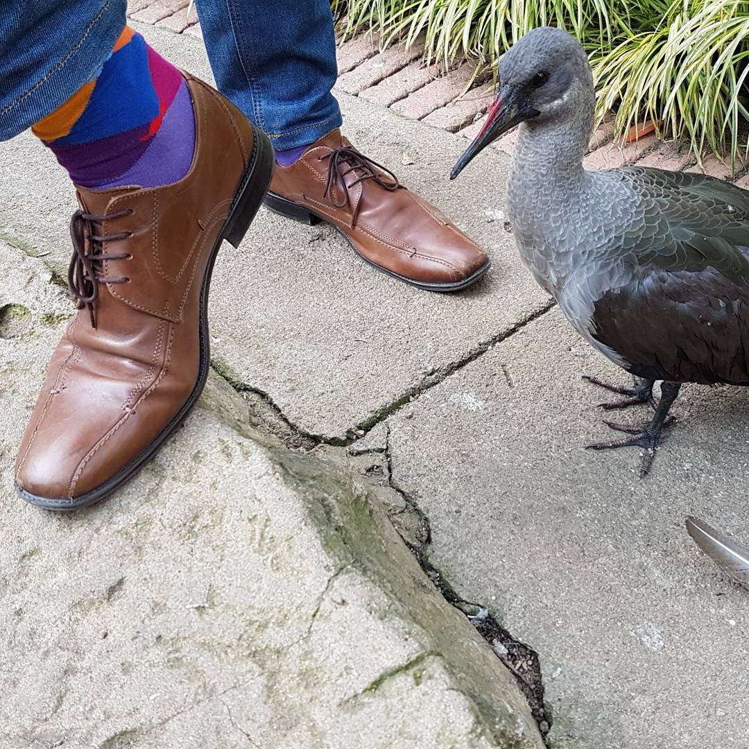 Na fotografii lze vidět dva ponožkomily z Nového Zélandu, hrdé členy Klubu Pánů z Ponožkovic. Ačkoli se Kevinovy ponožky (vpravo) zdají být před fotoaparátem trochu stydlivé, ve skutečnosti se při každé příležitosti směle vystavují na obdiv celému Aucklandu.