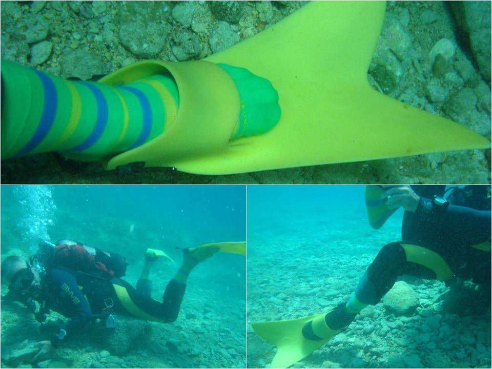 Vážení spolučlenové váženého klubu! Hned, jak jsem otevřel červencovou zásilku, pochopil jsme , co mi až dosud bytostně chybělo. Poslední nezbytná součást mé potápěčské výbavy. Jak jen mohla nejváženější rada tušit, jaká je hluboko pod vodou potápěči zima od ploutví? A nejenom to, jak sami můžete z přiložené fotodokumentace ráčit poznat, jedná se, díky vám o absolutně designově vyladěný komplet! Tuto bezchybnou nádheru obdivují všechny podmořské rybky, většina z nich neodolala, aby si nepřišla konfrontovat svá pruhovaná zbarvení s ponožkami člena Klubu pánů z Ponožkovic. Doufám, že v brzké době ponožkám neodolá ani mořská panna. Zároveň doufám, že kvalitu a design ponožek nepřijde otestovat nějaký podmořský dravec. Zkrátka, ponožky pánů z Ponožkovic úspěšně dobývají nejen nadmořské výšky, ale i podmořské hloubky !!!