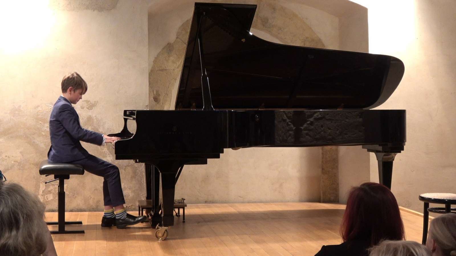 Mladý klavírní virtuos spojuje to nejlepší s nejlepším — pestrobarevné ponožky a piáno Steinway & sons