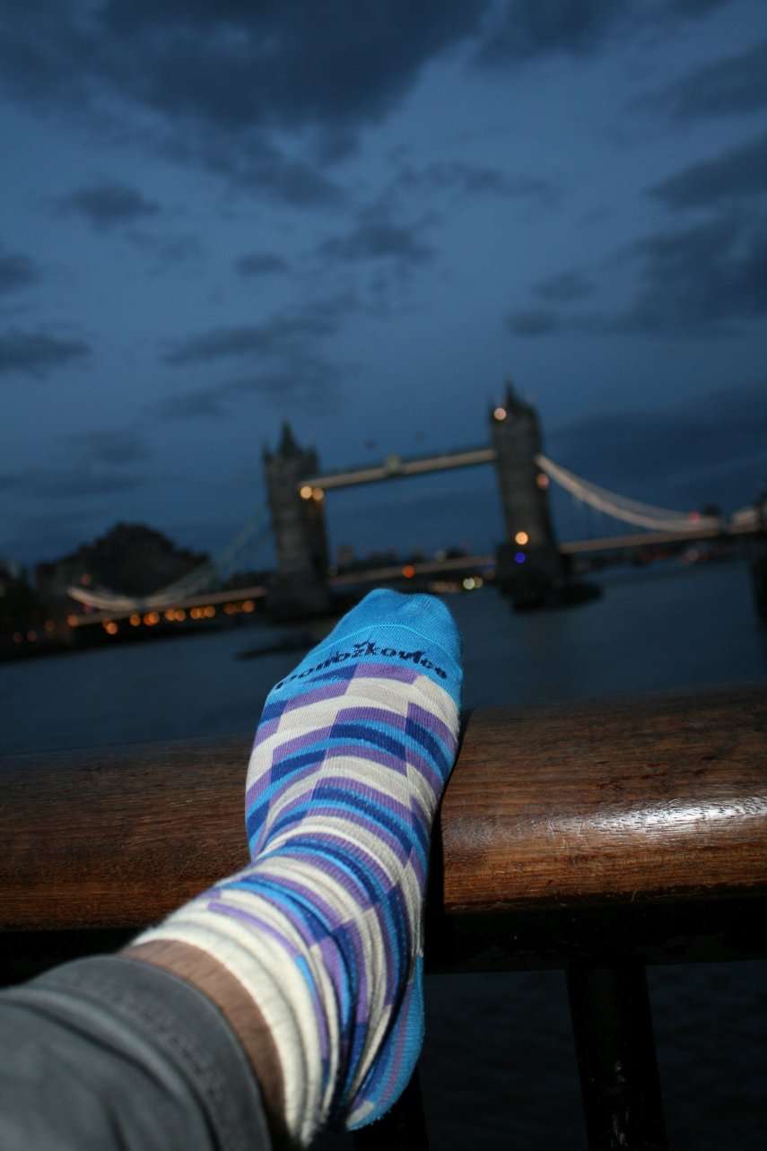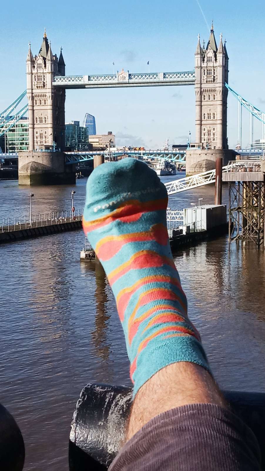 Ponožka na procházce Londýnem, za krásného, únorového dne, podpírající Tower Bridge.