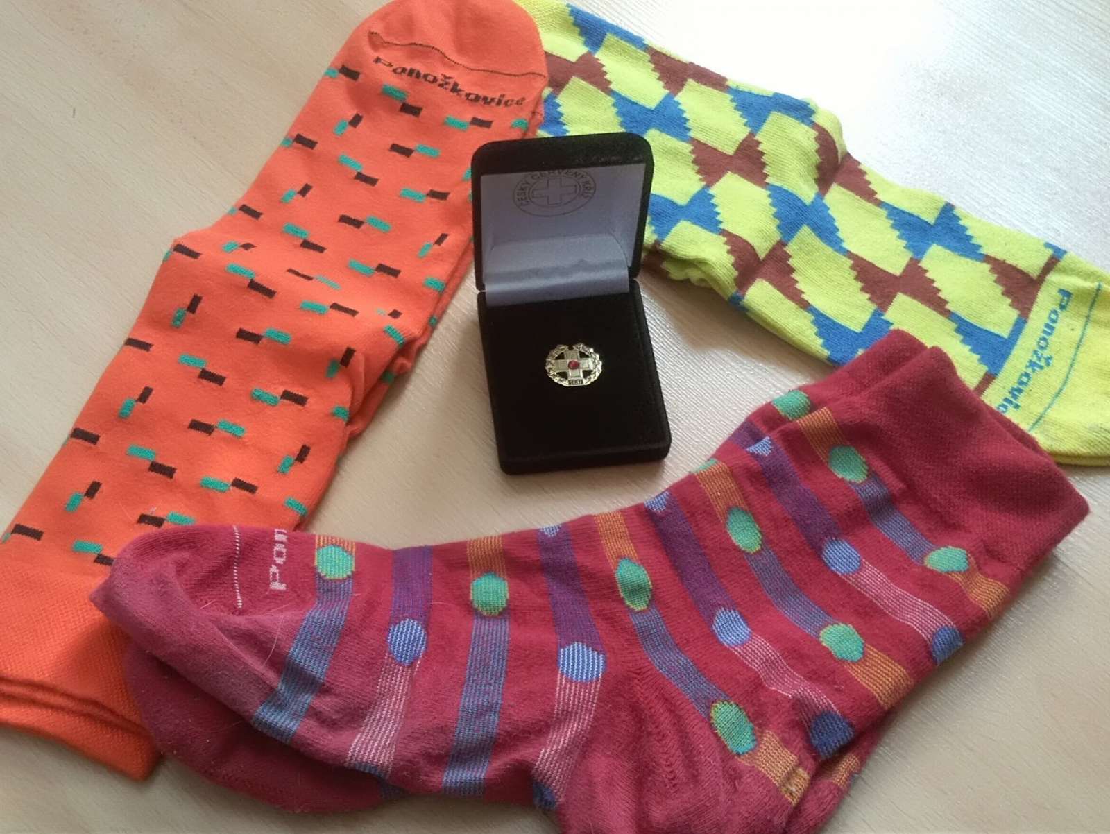 Moje malá sbírka ponožek spolu s mým čerstvě získaným oceněním Českého červeného kříže za 160 odběrů krve :-)